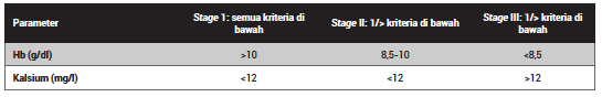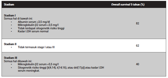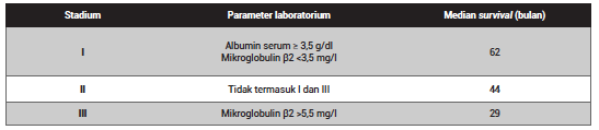 Pasien dengan MM aktif dikategorikan menurut sistem staging Durie-Salmon (tabel 3) atau International Staging System (ISS) (tabel 4). Sistem staging Durie-Salmon didasarkan pada densitas sel tumor pada sumsum tulang, pengukuran kerusakan end-organ ginjal, anemia, hiperkalsemia, lesi tulang litik), serta kadar immunoglobulin. 16,17