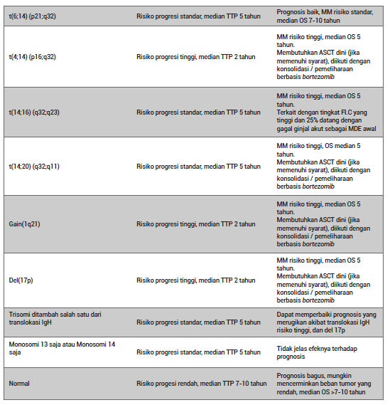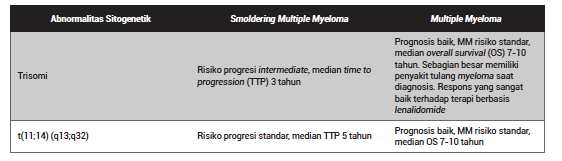 Meskipun multiple myeloma (MM) masih dianggap sebagai penyakit tunggal, pada kenyataannya penyakit ini merupakan kumpulan dari beberapa keganasan sel plasma yang berbeda secara sitogenetik. Pada studi FISH tentang sumsum tulang, sekitar 40% dari MM ditandai oleh adanya trisomi dalam sel plasma neoplastik (multiple myeloma trisomik), sedangkan sebagian besar sisanya memiliki translokasi yang melibatkan lokus rantai berat imunoglobulin (IgH) pada kromosom 14q32 (IgH mentranslokasi MM). Sebagian kecil pasien mengalami trisomi dan translokasi IgH. Translokasi trisomi dan IgH dianggap sebagai kelainan sitogenetik primer dan terjadi pada saat pembentukan MGUS. Selain itu, perubahan sitogenetik lain yang disebut kelainan sitogenetik sekunder muncul di sepanjang perjalanan penyakit MM, termasuk gain(1q), del(1p), del(17p), del(13), mutasi RAS, dan translokasi sekunder yang melibatkan MYC. Baik kelainan sitogenetik primer dan sekunder dapat memengaruhi perjalanan penyakit, respons terhadap terapi, serta prognosis. Interpretasi dan dampak kelainan sitogenetik yang bermakna pada MM bervariasi tergantung pada fase penyakit di mana kelainan tersebut terdeteksi (tabel 2).15