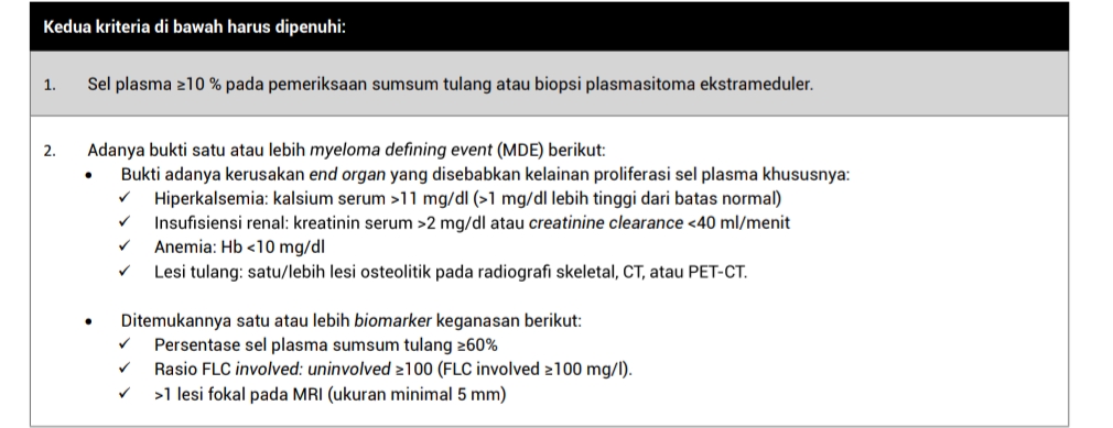 Multiple myeloma (MM) merupakan keganasan sel plasma yang ditandai oleh proliferasi klonal sel plasma ganas di sumsum tulang dengan protein monoklonal dalam serum dan/atau urin serta disfungsi organ terkait disertai dengan morbiditas dan mortalitas substansial, berupa end-organ damage: gangguan ginjal, hiperkalsemia, lesi tulang litik, dan anemia.1,2