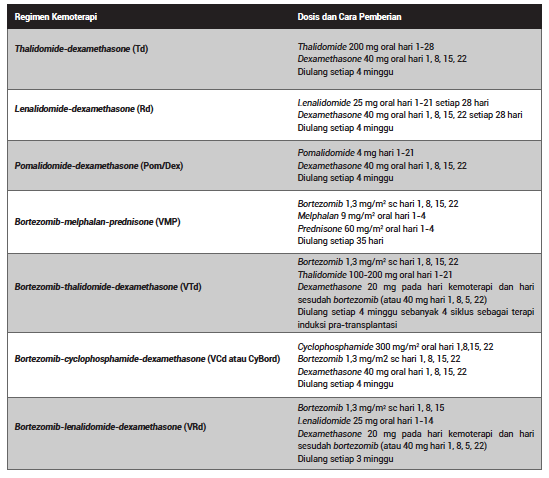 Kelangsungan hidup pada MM telah meningkat secara signifikan dalam 15 tahun terakhir. Dampak awal berasal dari diperkenalkannya thalidomide, bortezomib, dan lenalidomide. Dalam dekade terakhir, , pomalidomide, panobinostat, ixazomib, elotuzumab, daratumumab, isatuximab, dan selinexor telah disetujui oleh Food and Drug Administration (FDA) untuk pengobatan MM yang kambuh, dan dapat untuk meningkatkan hasil lebih lanjut. Banyak kombinasi telah dikembangkan dengan menggunakan obat yang menunjukkan aktivitas pada MM, dan regimen yang paling umum digunakan tercantum dalam tabel 6. Obat-obat yang digunakan dalam tata laksana MM bekerja melalui berbagai mekanisme, beberapa di antaranya tidak sepenuhnya dipahami. Thalidomide, lenalidomide, dan pomalidomide disebut agen imunomodulator (IMiDs); mereka berikatan dengan cereblon dan mengaktifkan aktivitas cereblon E3 ligase. Hal ini menghasilkan ubiquitination yang cepat dan degradasi dari dua faktor transkripsi sel B spesifik, Ikaros family zinc finger proteins Ikaros (IKZF 1) dan Aiolos (IKZF3). Obat ini dapat menyebabkan sitotoksisitas langsung dengan menginduksi kerusakan DNA yang dimediasi oleh radikal bebas. Selain itu, obat ini juga memiliki sifat antiangiogenesis, penghambatan tumor necrosis factor alpha (TNF-α), dan efek imunomodulator. , dan ixazomib adalah golongan proteasome inhibitor. Elotuzumab adalah terapi tertarget yang bekerja pada SLAMF7; daratumumab dan isatuximab bekerja pada target CD38; sementara panobinostat adalah suatu deacetylase inhibitor.15