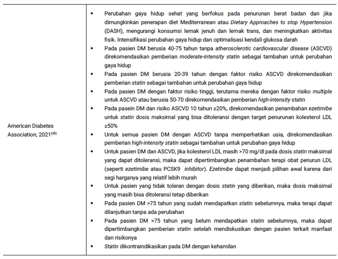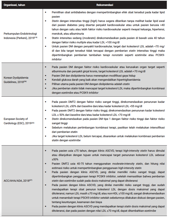 1. Panduan pengelolaan dislipidemia aterogenik Hampir semua panduan pengelolaan dislipidemia aterogenik yang dikeluarkan oleh organisasi seminat besar di dunia mengedepankan pengelolaan optimal untuk kolesterol LDL baik, dengan menggunakan baik moderate-intensity statin maupun high-intensity statin. Rangkuman panduan pengelolaan dislipidemia pada pasien diabetes melitus dapat dilihat pada tabel 2.