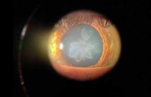 Gambar 1. Tampak kekeruhan abu-abu putih subkapsular dengan gambaran seperti serpihan salju (snowflake cataract)[12]