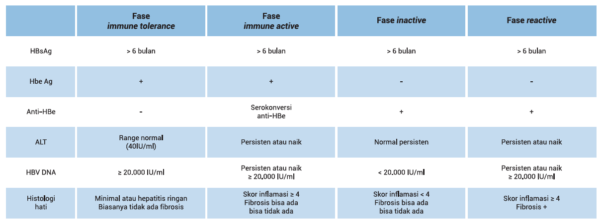 Menurut Konsesus Nasional Penatalaksanaan Hepatitis B (2017), indikasi terapi pada infeksi hepatitis B ditentukan berdasarkan kombinasi dari empat kriteria, antara lain nilai serum HBV DNA, status HBeAg, nilai ALT (enzim penanda inflamasi atau kerusakan hati) dan gambaran histologi hati.