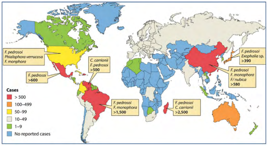 Gambar 1. Distribusi global kromoblastomikosis berdasarkan rangkaian kasus yang dilaporkan.1