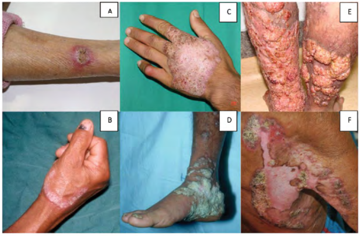 Lesi tipe nodular berupa lesi yang menonjol, lembut, berwarna kusam hingga merah muda, permukaan halus, verukosa atau bersisik, secara bertahap dapat menjadi tumor. Lesi jenis tumor, ukurannya lebih besar dan lebih menonjol, berbentuk papilomatosa, kadang berlobus- lobus disertai krusta dan keratosis. Jenis ini paling sering terjadi pada area kaki dan tibia, memiliki gambaran menyerupai kembang kol (cauliflower).1,15,21 Lesi verukosa ditandai dengan hiperkeratosis menyerupai veruka vulgaris. Lesi plakat merupakan bentuk tersering pada KBM dengan berbagai bentuk dan ukuran, berwarna kemerahan sampai keunguan dan bersisik pada permukaannya. Lesi sikatrikal adalah lesi kulit dengan atropik jaringan parut, sementara di pusat lesi terjadi proses penyembuhan, lesi dapat berbentuk lesi anular dan melengkung dalam lesi. Lesi hanya mengenai satu ekstremitas. Komplikasi dari KBM termasuk limfedema lokal, yang bisa menjadi elefantiasis dan karsinoma skuamosa pada beberapa lesi kronis.1,3,22