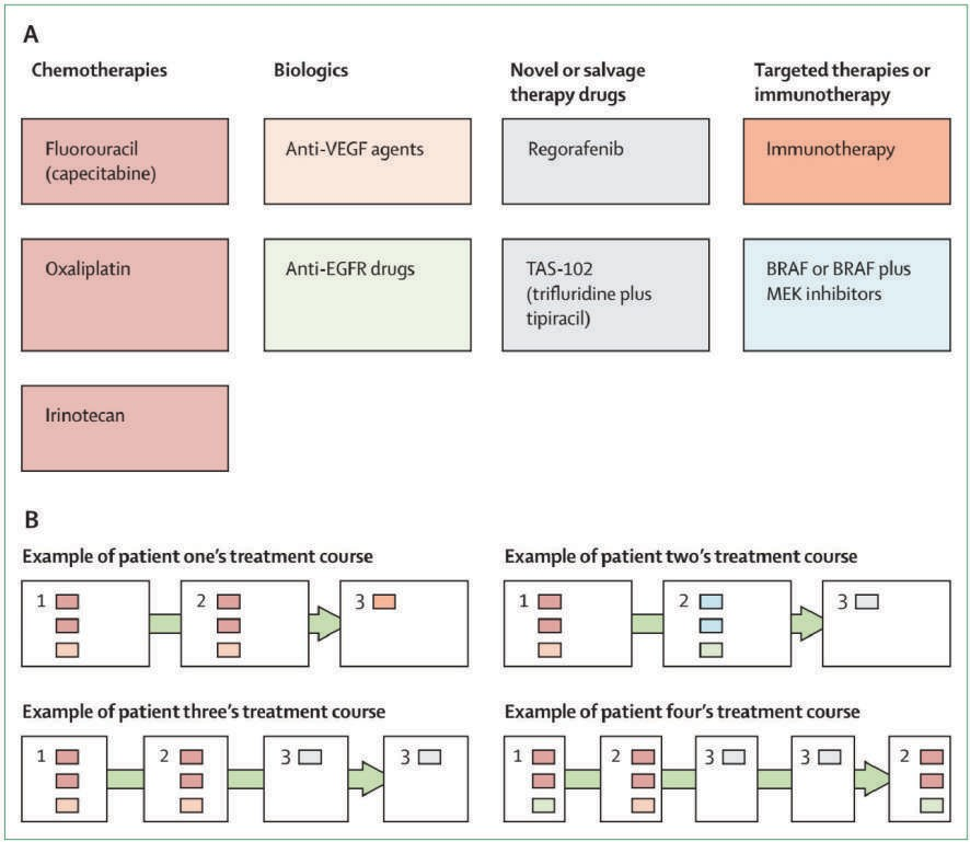 Gambar 2. (A) Agen terapi sistemik yang dapat digunakan dalam tata laksana kanker kolorektal metastasis. (B) Pada kasus metastasis, umumnya digunakan kombinasi terapi sebagaimana ditunjukkan dengan kotak-kotak berwarna, baik kombinasi antara kemoterapi dengan agen biologis maupun regimen terapi lainnya bergantung pada faktor tumor maupun faktor pasien (misalnya: lokasi tumor, mutasi, microsatellite instability, dsb.)[21]