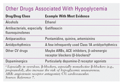Selain itu, obat-obatan lain juga dicurigai dapat menyebabkan terjadinya hipoglikemia. Sebagai contoh salisilat dan antagonis reseptor beta-adrenergik, dapat menyebabkan hipoglikemia pada kasus overdosis, namun jarang sekali terjadi pada dosis standar. Satu hal yang perlu diperhatikan bahwa obat-obatan beta-bloker, terutama yang nonselektif betabloker, dapat menyebabkan hipoglikemia tanpa disadari (hypoglycemia unawareness) dengan menurunkan berbagai gejala adrenergic hipoglikemia seperti termor maupun palpitasi atau jantung berdebar-debar. Hipoglikemia juga sering terjadi pada pasien rawat inap seperti pasien sepsis atau penyakit kritis lainnya, pasien tanpa asupan per oral.