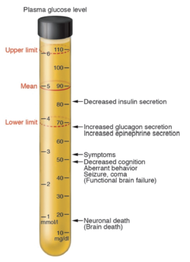 Salah satu akibat apabila hipoglikemia tidak tertangani dengan baik adalah koma diabetik. Pada kondisi normal, penurunan kadar glukosa darah akan mengaktifkan mekanisme homeostasis tubuh dengan meningkatkan sekresi glukagon dan menurunkan sekresi insulin. Jika mekanisme fisiologis ini gagal untuk menjaga kadar glukosa darah untuk kembali normal, akan menimbulkan gejala neurogenik. Jika tidak ditangani dan kadar glukosa darah terus menurun akan menimbulkan gejala neuroglikopenia yang ditandai dengan adanya gangguan kesadaran dari penderita maupun dapat terjadi kejang. Kadar glukosa darah yang turun sampai pada kadar 41-49 mg/dL (2,3-2,7 mmol/L) dapat memicu terjadinya kehilangan kesadaran atau koma dan kerusakan neurologis yang permanen dapat terjadi jika kadar glukosa darah tidak segera dikoreksi. Salah satu studi menunjukkan bahwa pada kondisi terjadi penurunan kadar glukosa di dalam otak dapat meningkatkan produksi superoksida hypoglikemia dengan adanya aktivasi enzim NADPH oksidase yang dapat meningkatkan risiko kematian sel-sel neuron. Studi ini juga menunjukkan bahwa produksi superoksida hipoglikemia dan enzim NADPH oksidase dapat diturunkan seiring dengan peningkatan kadar glukosa darah. Oleh karena itu, jika terjadi hipoglikemia seharusnya dengan segera dikoreksi untuk menurunkan risiko yang lebih parah seperti kematian sel neuron pada otak.