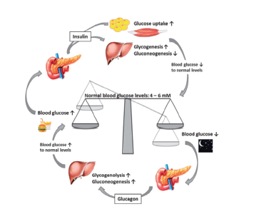 Secara normal, setelah seseorang makan, sekresi insulin akan meningkat agar terjadi pengambilan glukosa pada hati dan jaringan perifer secara optimal. Sedangkan glukagon akan berkerja secara berlawanan yaitu sekresi glukagon menjadi berkurang. Pada saat kadar glukosa darah rendah (misalnya pada orang berpuasa), sekresi glukagon akan meningkat, sehingga dapat meningkatkan kadar glukosa darah dengan cara menstimulasi pemecahan glikogen yang tersimpan dalam hati menjadi glukosa dan meningkatkan proses glukoneogenesis.