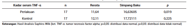 Keterangan: Hasil analisis uji normalitas Saphiro-Wilk (TNF-α: tumor necrosis factor alpha; p>0,05: distribusi data normal, p<0,05: distribusi data tidak normal)