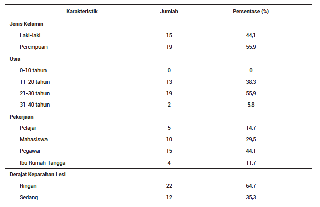 Subjek sejumlah 34 orang terdiri dari 19 orang laki-laki (55,8%) dan 15 orang perempuan (44,1%) dengan rentang usia terbanyak adalah 21-30 tahun (55,9%). Jenis pekerjaan pada subjek penelitian bervariasi antara lain pegawai (44,1%), mahasiswa (29,5%), pelajar (14,7%) dan ibu rumah tangga (11,7%). Derajat keparahan lesi AV derajat ringan sebanyak 22 orang (64,7%) dan derajat sedang sebanyak 12 orang (35,3%). Karakteristik subjek penelitian dapat dilihat pada tabel 1