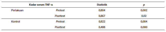 Tabel 2. Uji normalitas kadar serum TNF-α pada pretest dan posttest kelompok perlakuan dan kontrol