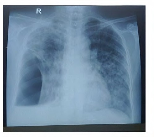 Gambar 1. Gambaran foto toraks pada pasien pneumotoraks sekunder akibat TB paru menggambarkan adanya pneumotoraks di sebelah kanan bawah paru dengan luas menurut kriteria Light sebesar >20%, infiltrat yang sudah menyebar luas di paru kanan dan paru kiri bawah.