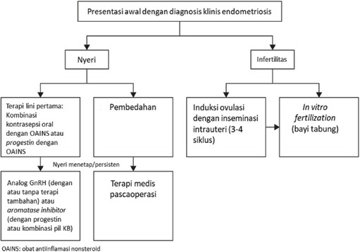 Tata laksana endometriosis dibagi menjadi dua kelompok besar berdasarkan gejala utama, yaitu nyeri terkait endometriosis dan infertilitas.22 Tata laksana medikamentosa dan pembedahan, keduanya memberi hasil yang efektif dalam penanganan nyeri terkait endometriosis.18 Tata laksana medikamentosa yang tersedia saat ini hanya sebatas memodulasi gejala dengan cara menekan fungsi ovulasi atau menginduksi kondisi hipoestrogenik, namun belum terdapat terapi yang mampu mengintervensi patofisiologi endometriosis secara langsung dengan profil keamanan yang baik dan kandungan efek kontrasepsi yang tidak diinginkan pada wanita yang merencanakan kehamilan.1,31