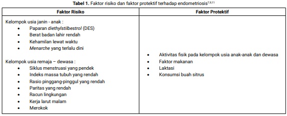 Diagnosis yang terlambat dan onset gejala endometriosis dapat mengakibatkan tertundanya penanganan endometriosis secara dini sehingga memungkinkan perkembangan endometriosis menjadi derajat berat.7,9 Profil genetik, aktivitas hormon, proses inflamasi, dan imunologi memainkan peran penting dalam manifestasi dan progesivitas endometriosis.10 Beberapa penelitian mempelajari kaitan antara faktor risiko endometriosis yang spesifik dalam kelompok usia tertentu.