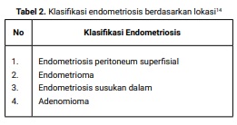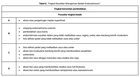 Konsensus World Endometriosis Society pada tahun 2014 memutuskan bahwa model klasifikasi penyakit endometriosis dapat menggunakan klasifikasi dari Revised American Society for Reproductive Medicine (r-ASRM), klasifikasi Enzian, dan Endometriosis Fertility Index (EFI). Hingga ditemukannya sistem klasifikasi yang lebih baik, ahli bedah sebaiknya menggunakan sistem klasifikasi endometriosis r-ASRM dan Enzian untuk mengoptimalkan informasi pascaoperasi. Derajat endometriosis dalam klasifikasi r-ASRM mempunyai korelasi yang terbatas dengan tingkat beratnya gejala dan infertilitas terkait endometriosis. Klasifikasi Enzian digunakan untuk menilai deeply infiltrative endometriosis (DIE).15,16
