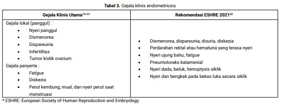 Endometriosis adalah penyakit kronis yang ditandai dengan keberadaan jaringan endometrium yang terdiri dari kelenjar dan stroma, di luar rongga endometrium, yang berhubungan dengan timbulnya nyeri panggul dan infertilitas. Lesi endometriosis ektopik ini banyak ditemukan di rongga panggul seperti pada ovarium, ligamentum, peritoneum, usus, dan kandung kemih.3–5 Definisi klasik yang sudah disebutkan sebelumnya sudah tidak lagi mencerminkan ruang lingkup dan manifestasi penyakit yang sebenarnya. Saat ini endometriosis lebih dianggap sebagai penyakit sistemik daripada penyakit lokal pada panggul, karena endometriosis juga memengaruhi metabolisme di hati dan jaringan adiposa sehingga mencetuskan kondisi inflamasi sistemik serta mengubah ekspresi gen di otak yang menyebabkan sensitisasi nyeri dan gangguan mood.6