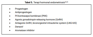 Meskipun bervariasi, terapi hormonal ini memiliki kemampuan yang tidak jauh berbeda dalam mengatasi gejala nyeri dan memberikan tingkat perbaikan klinis. Namun dalam praktik klinis, masing-masing terapi mempunyai implikasi yang berbeda, mengingat tidak ada terapi hormonal yang bebas dari efek samping,34 seperti adanya kandungan efek kontrasepsi yang tidak dianjurkan bagi wanita yang berencana untuk hamil. Pedoman ESHRE tahun 2021 merekomendasikan penggunaan progestogen, PKK, agonis GnRH, atau antagonis GnRH untuk mengatasi gejala nyeri terkait endometriosis.22,31,35