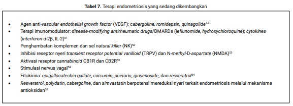 Sejumlah terapi yang sedang dikembangkan mempunyai target terapi yang spesifik yaitu aspek imunologi, angiogenik, hormonal, genetik, neurogenesis lokal, dan sensitisasi sentral dari patogenesis penyakit endometriosis dengan harapan memiliki potensi yang lebih baik dalam menghasilkan regresi penyakit.1,31