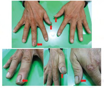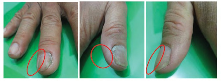 Gambar 1. Pada regio unguium digiti 1,3 dextra et digiti 1 sinistra tampak patch hiperpigmentasi kehijauan multipel disertai onikodistrofi (panah merah).