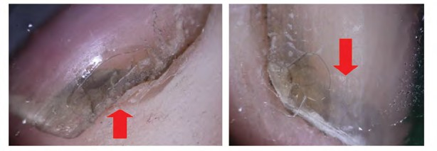 Gambar 2. Pemeriksaan dermoskopi. Tampak pigmentasi berwarna hijau kehitaman pada lateral kuku (panah merah)