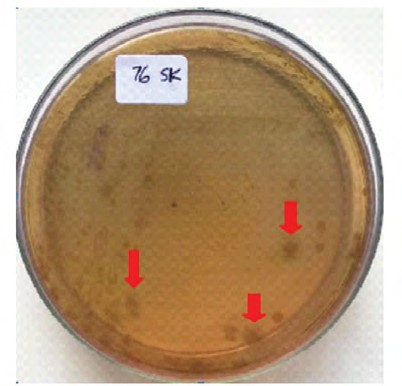 Gambar 3. Hasil pemeriksaan kultur pada media agar MacConkey dari swab dasar kuku didapatkan koloni pertumbuhan Pseudomonas aeruginosa berwarna coklat kehijauan (panah merah).